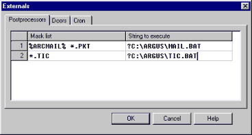 %ARCMAIL% collectively specifies Fidonet ARCmail packets ending in .M01, .TU2, WE8, etc. When such a file is received, MAIL.BAT is called. The "?" question mark specifies to run the batch job hidden in the background.