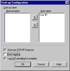 If you want your mailer line to open automatically upon start-up move the modem line to Auto-Open. Likewise, if the TCP/IP modem should answer at startup check the appropriate box.